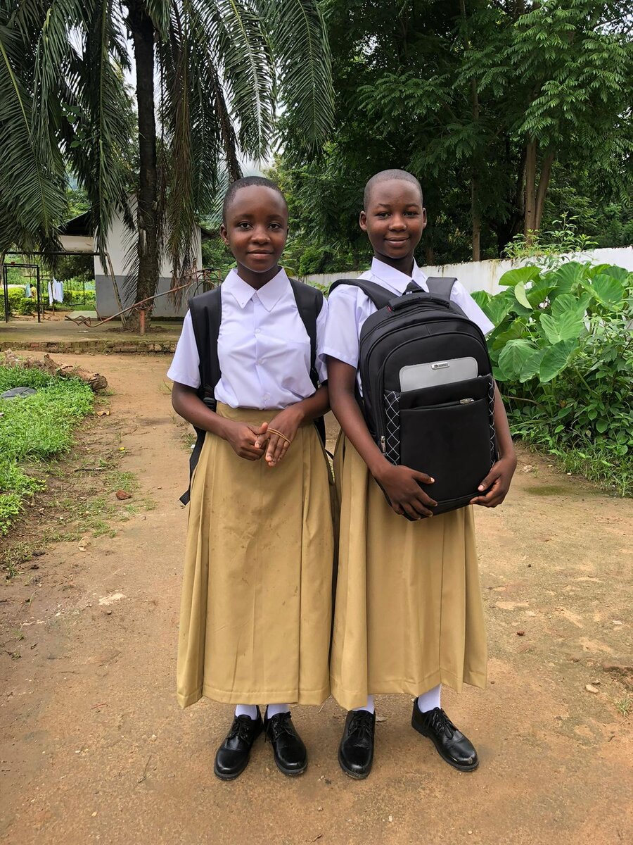 Hier im Bild ist sie (rechts) in ihrer Schuluniform mit ihrer Freundin Esther zu sehen.