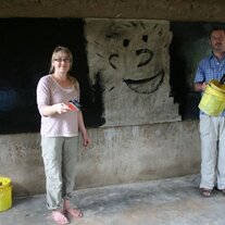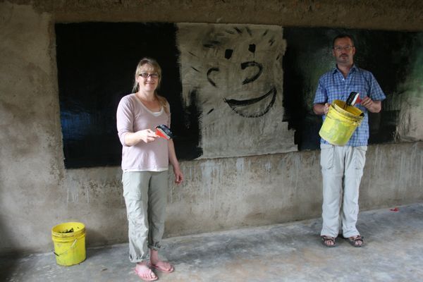 Die MACHICA-Freunde aus Deutschland dürfen die Tafel mit schwarzer Tafelfarbe anstreichen.