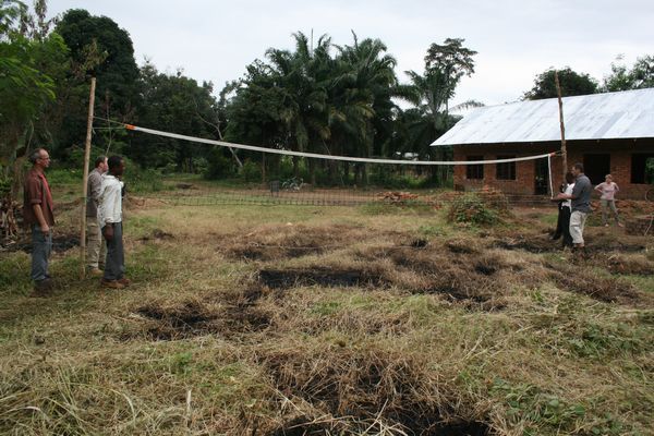 Das mitgebrachte Volleyballnetz wird vor der Schule aufgestellt.