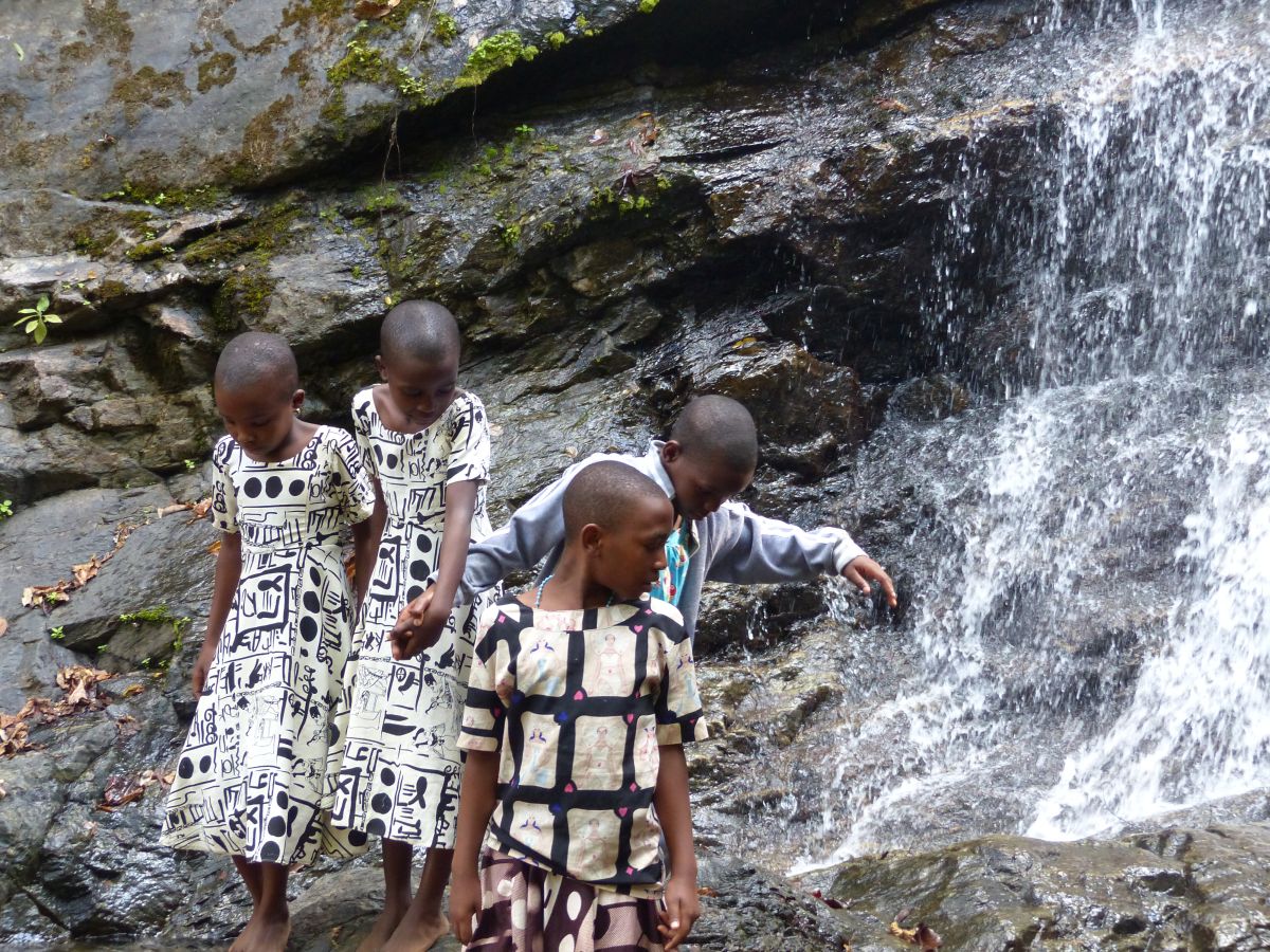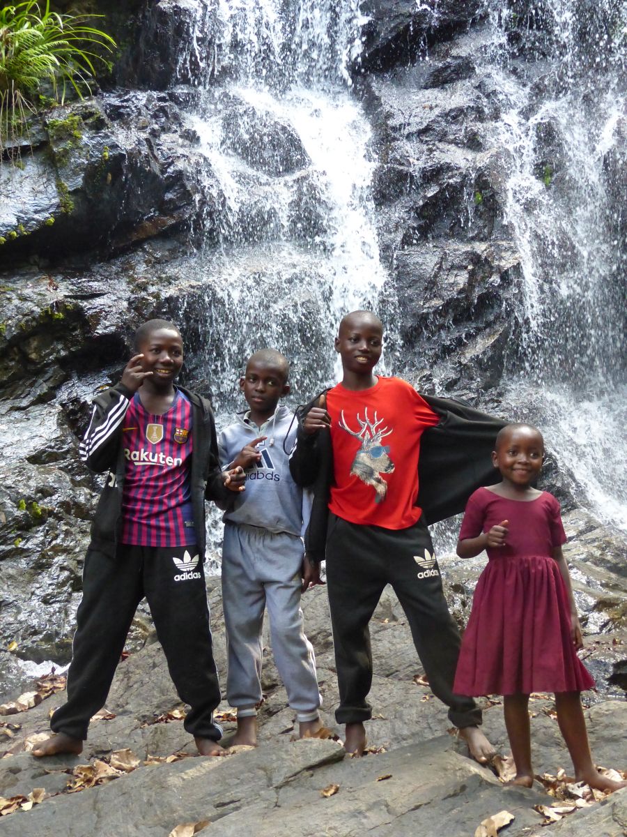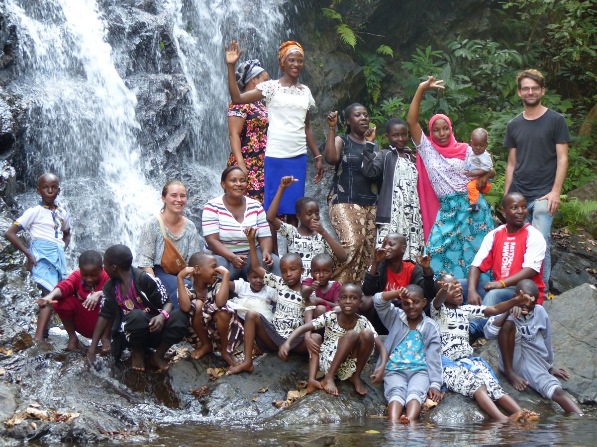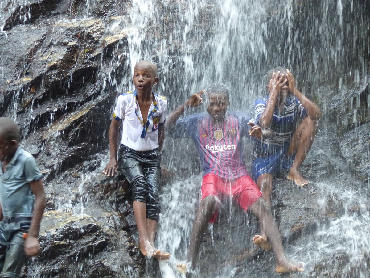 Mustafa, Modestus, Ashraf und Noella am Wasserfall